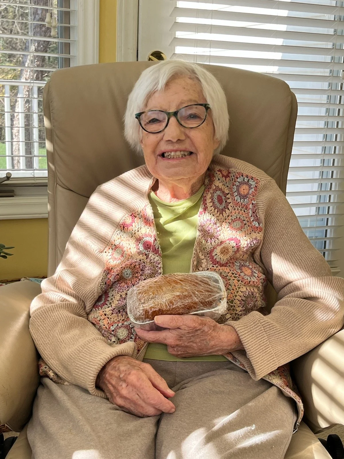 “Mitchie Hall (pictured, with pumpkin bread), who is 97 years old, loves the visits. She showed me things our team has given her in the past. She was so appreciative that we still remember her. We reminisced about the good old days and laughed a lot.”
